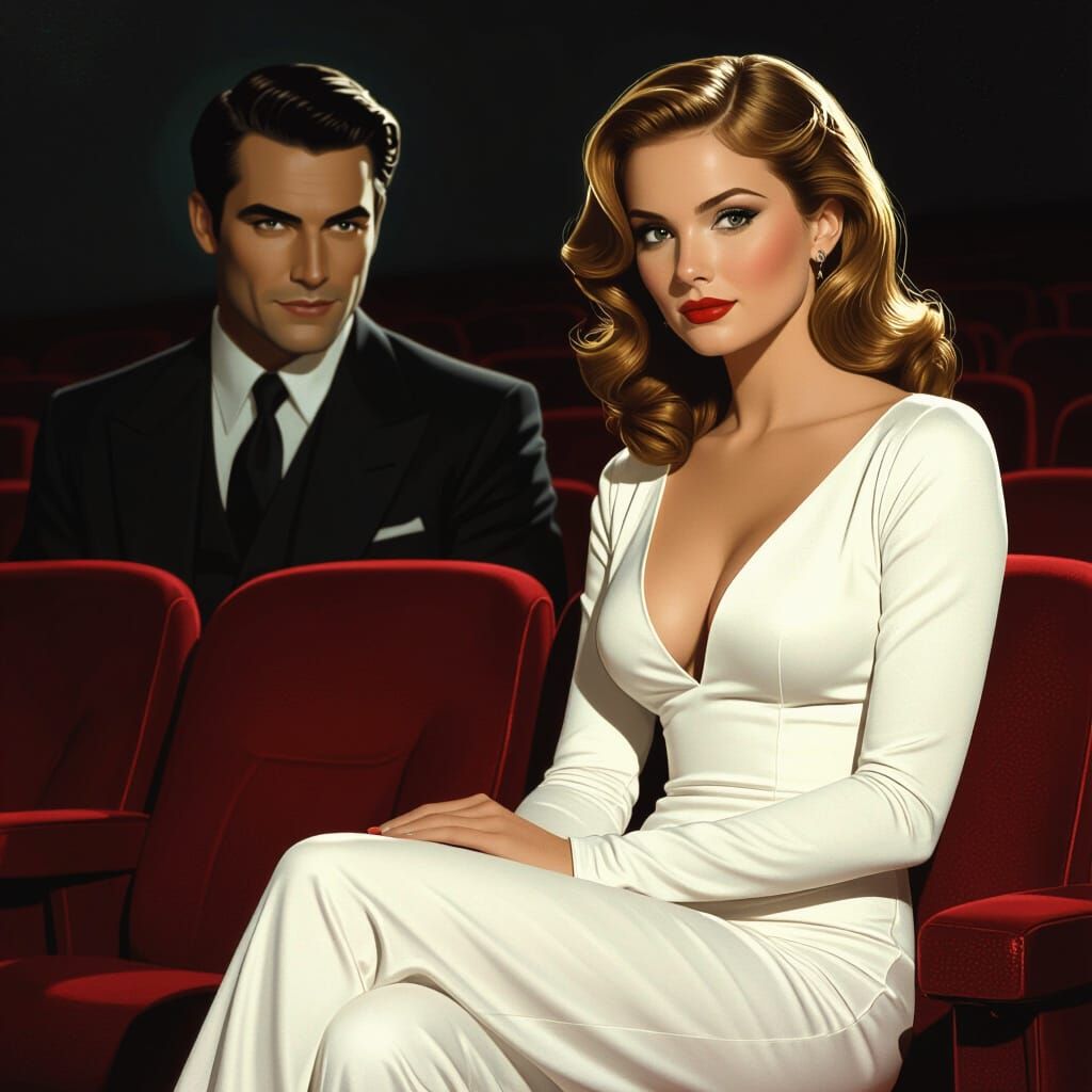 This image shows a woman in a white dress engrossed in a movie at a cinema. Behind her, a man smiles. The artwork is reminiscent of elegant art nouveau illustrations with cinematic lighting.