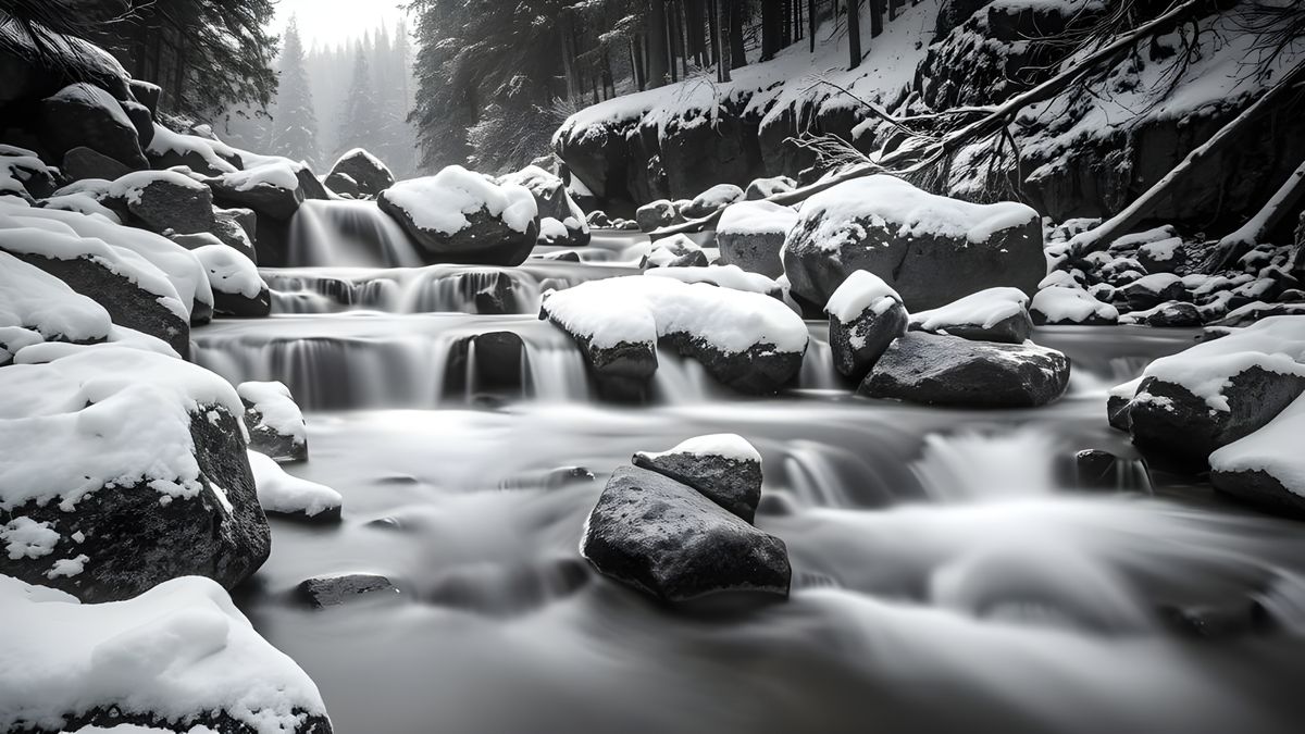 This image shows a serene mountain stream in winter, captured in striking black and white tones, with waterfalls and snow-covered boulders set against a crisp, natural backdrop.