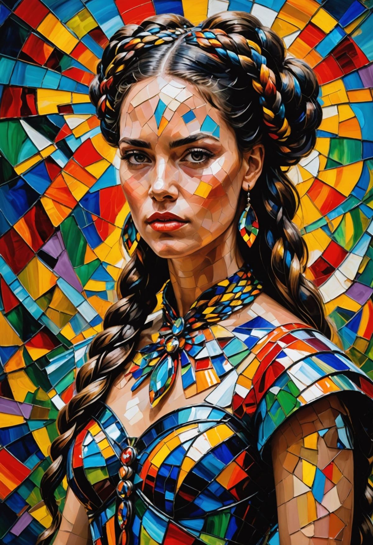 This image shows a goddess with large ribboned braids and a fractal gown in a surreal landscape. The art style features thick, wet oil paint textures and vibrant, stained-glass inspired makeup.