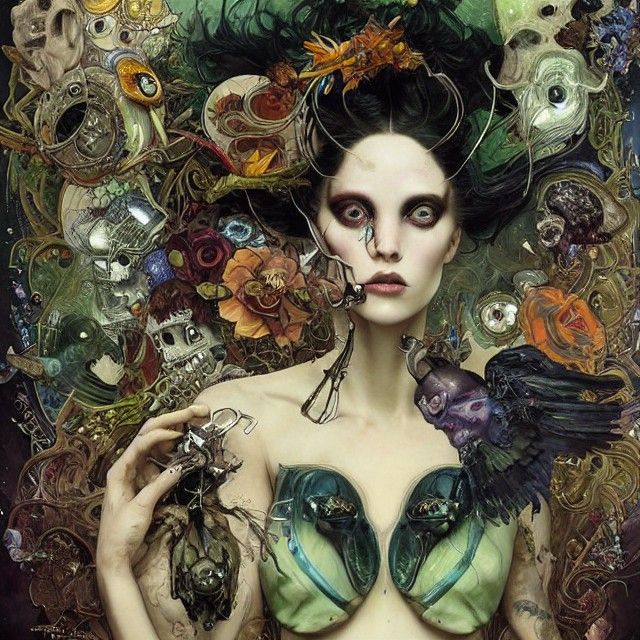 an electic bird skull crawling with space fleas Sinister, Decadent, Hyperdetailed Delicate; Complex; Eldritch; Deep green Colors; Regal; Tom...