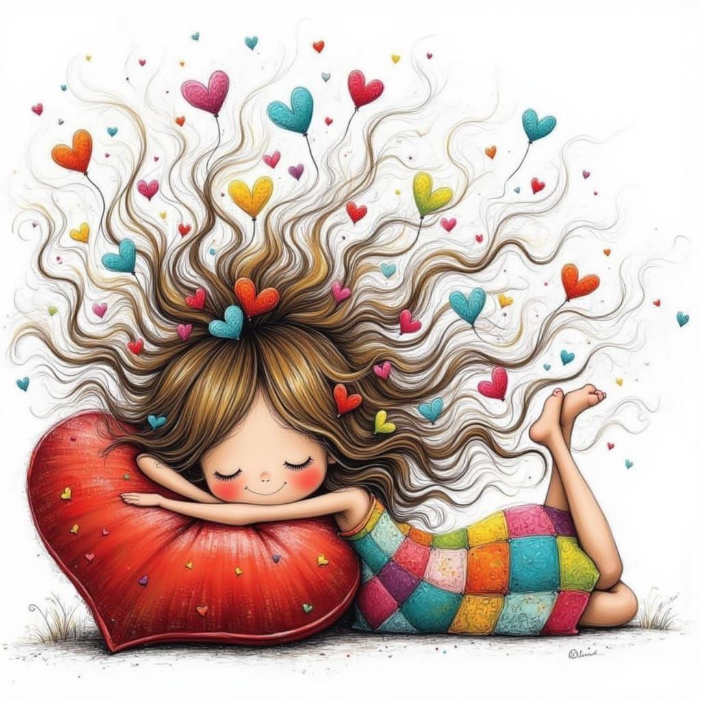 This image shows a girl resting on a large red heart-shaped pillow while wearing a patchwork dress. Love hearts gently float around her hair, creating a whimsical scene.