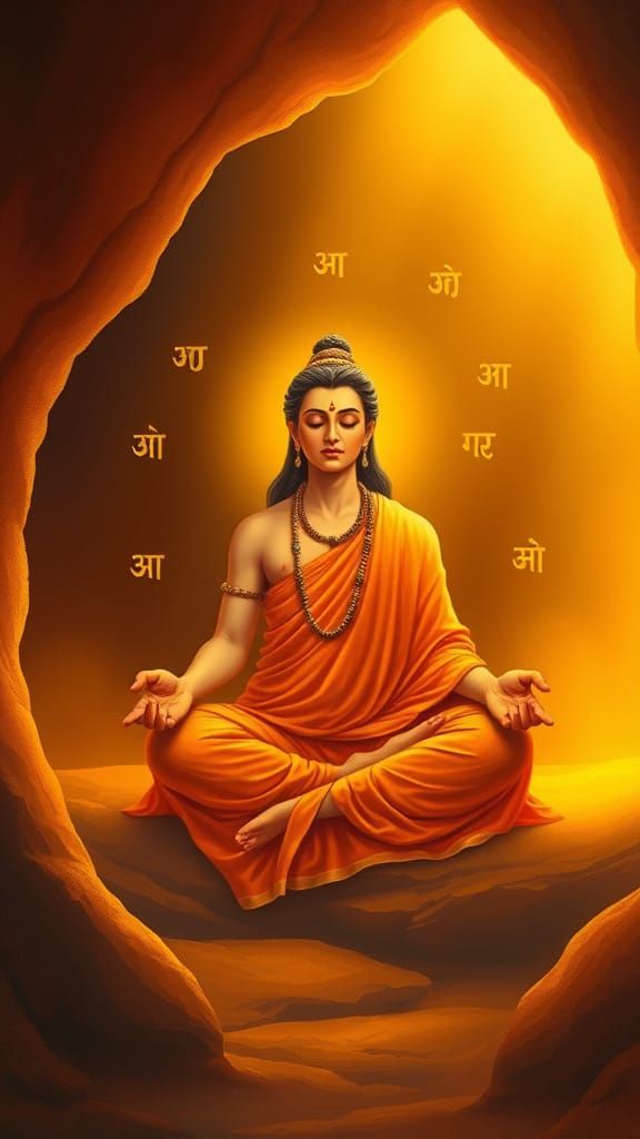A striking picture of a divine figure meditating in a glowing cave. The artwork features warm tones and Sanskrit symbols, reminiscent of traditional Indian art with a serene, peaceful atmosphere.