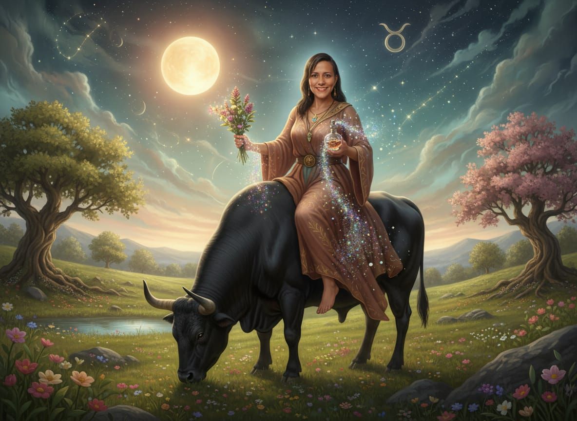 This mystical image features a Taurus goddess astride a black ox, holding sacred herbs and a glittering perfume. A celestial aura surrounds her, with Venus and Taurus symbols in the background.