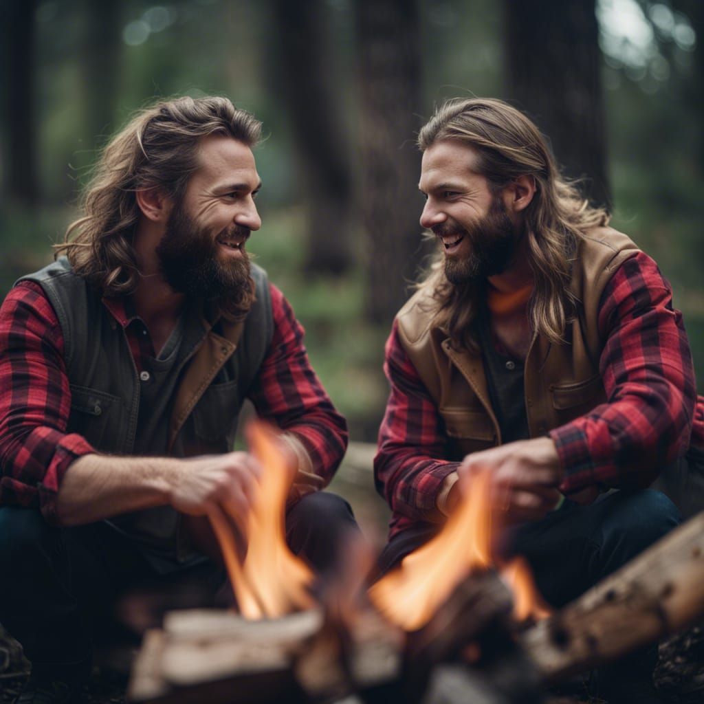 A sharply focused, professional photograph depicts two handsome, longhaired, bearded lumberjacks happily working together to start a campfire in natural lighting.