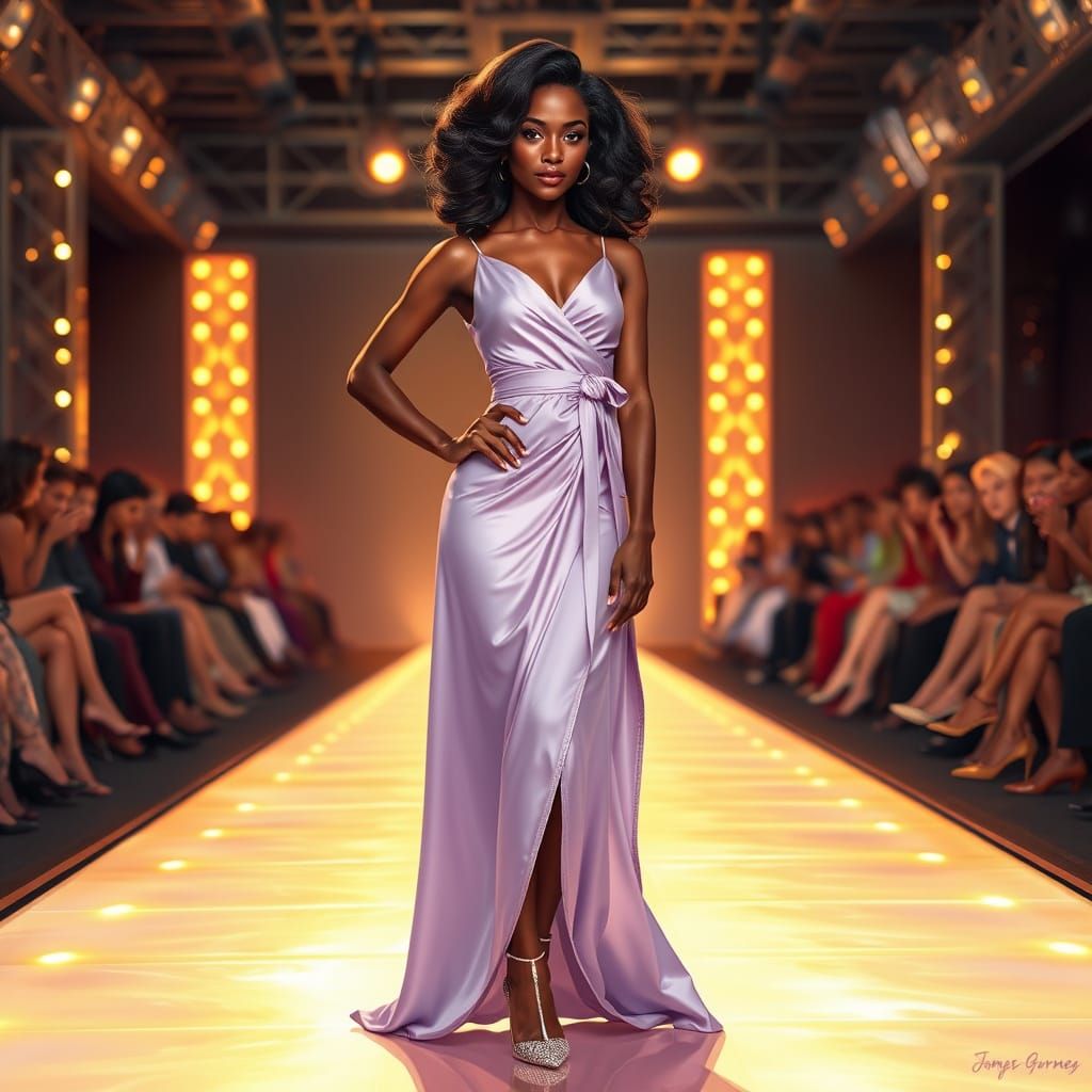A stunning image of a confident African American woman exuding glamour on a radiant runway, adorned in a soft lilac silk dress and delicate silver shoes, set against a backdrop of shimmering lights and an awestruck audience, reminiscent of the Old Masters with a modern flair