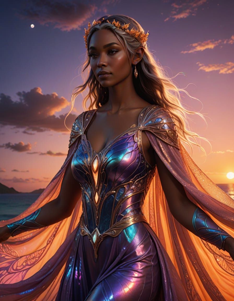 A striking picture of an athletic elf radiating energy in a flowing gown. The digital artwork features intricate textures, shimmering accents, and a bioluminescent glow against a warm, colorful sky.