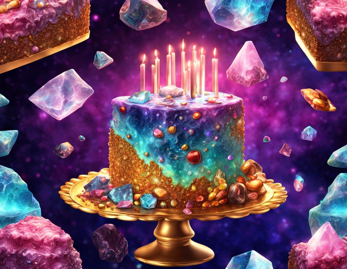 A striking picture of a cake made of gemstones. The image is a maximalist digital painting with cosmic holographic elements, rendered in vivid detail.