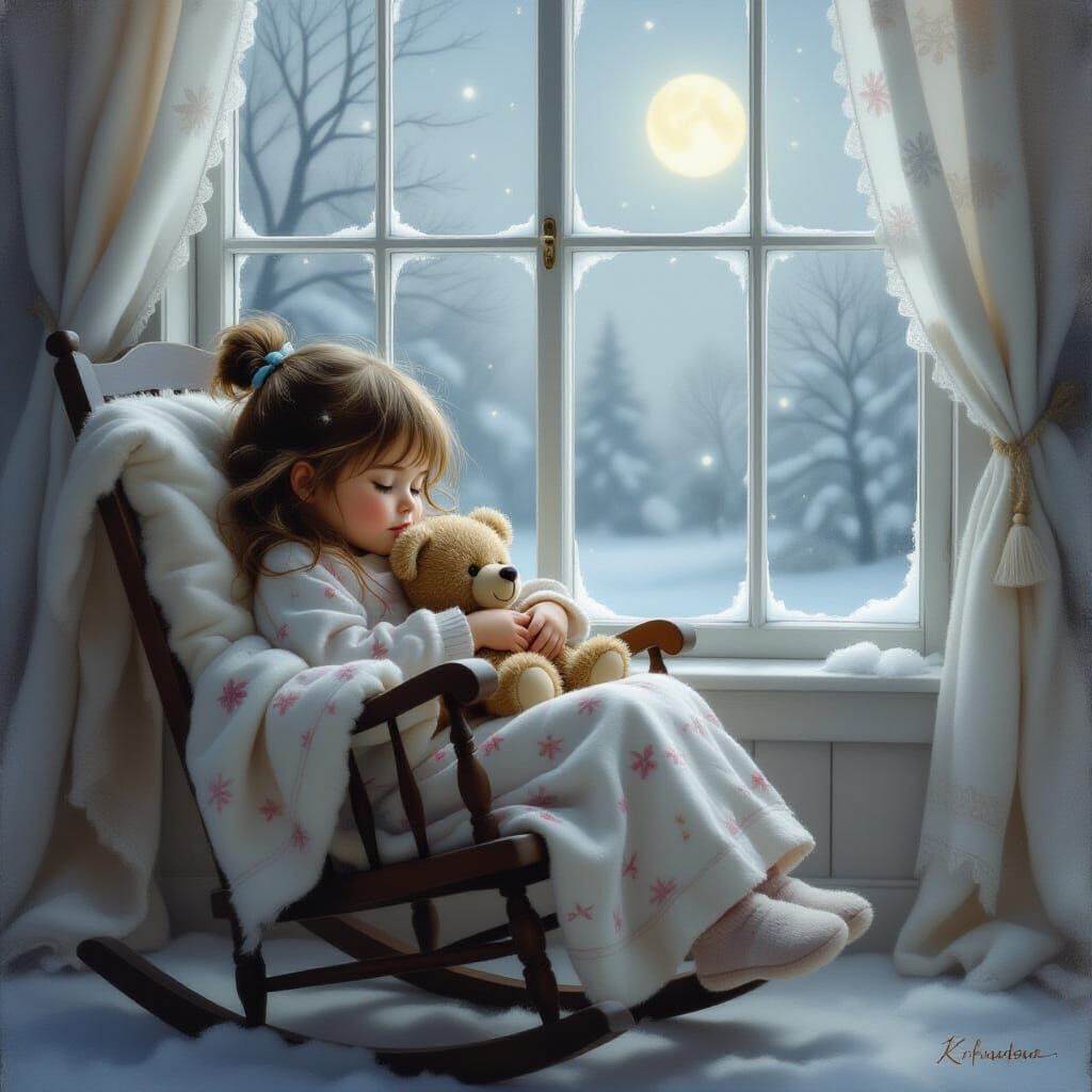 This image shows a child asleep in a rocking chair with a teddy bear. A window with lace curtains reveals a misty winter night in this artwork reminiscent of Kinkade.