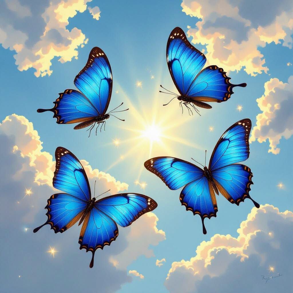 This digital painting shows three blue butterflies in a disarrayed flight against a clear sky with soft clouds. The scene captures brilliant golden hour light and a sense of wonder, rendered with vibrant colors and soft focus.