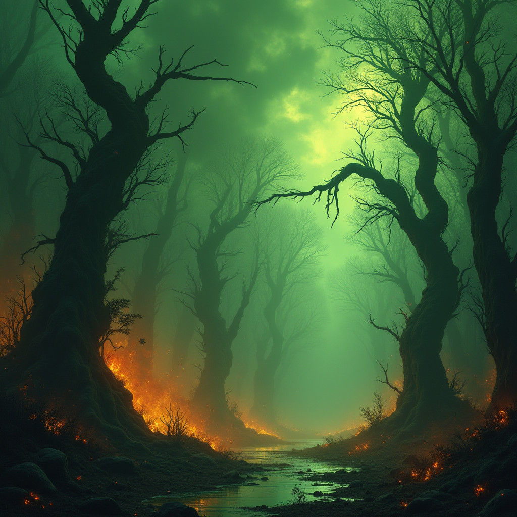 A captivating image of a fire-lit swamp landscape featuring gnarled trees and swirling mist. The artwork combines eerie, atmospheric elements with a mystical, high-contrast aesthetic.