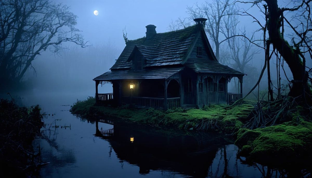 This digital matte painting depicts a decaying cottage by a foggy bayou. Overgrown vines and a single lantern create a mysterious, isolated, and eerie atmosphere with desaturated colors.