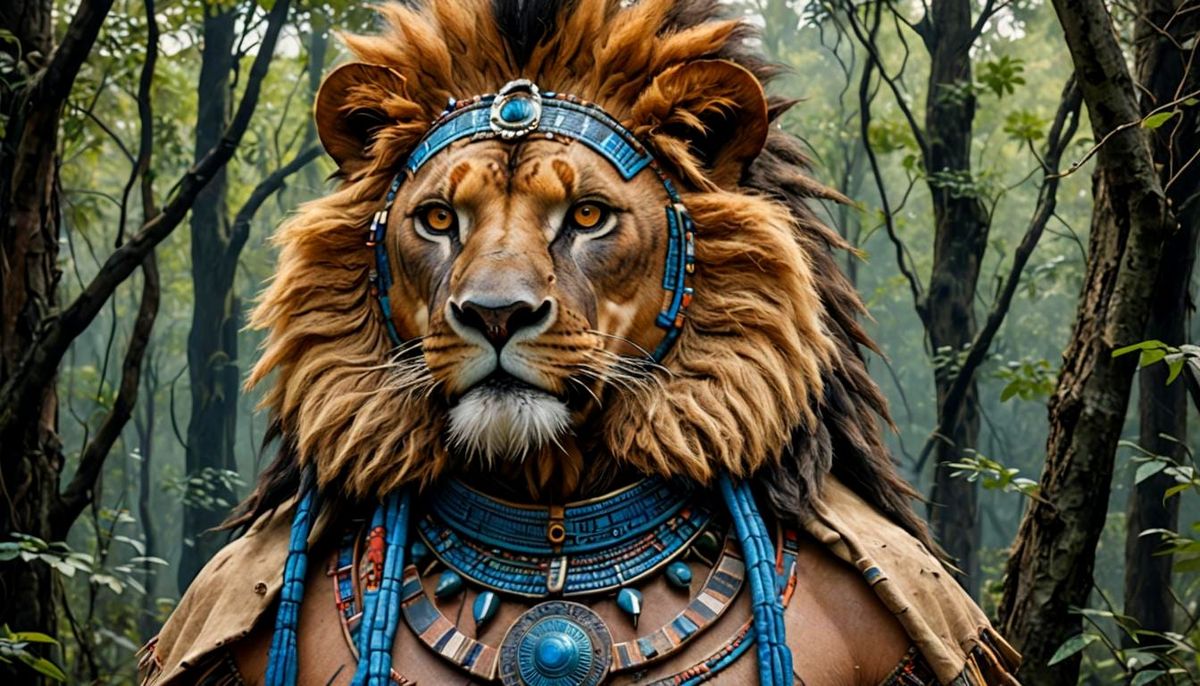A striking picture of a muscular, anthropomorphic lion shaman in tribal attire, looking frightened. The artwork features photorealistic rendering, dramatic lighting, and a fantasy aesthetic.