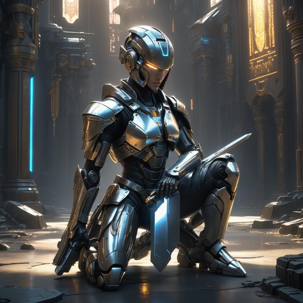 This image shows a kneeling, robotic paladin in a cyberpunk aesthetic. The hyperdetailed illustration features dynamic lighting, a held sword, and magical, cinematic elements.