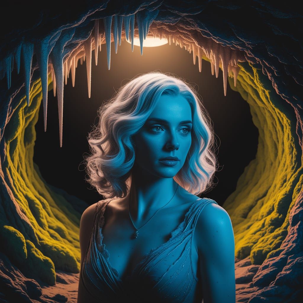 A detailed portrait of Rebecca Sugar in a mossy cavern, illuminated by subterranean light. Features yellow and blue hues with antique silver nitrate tones, rendered with a dreamcore aesthetic.
