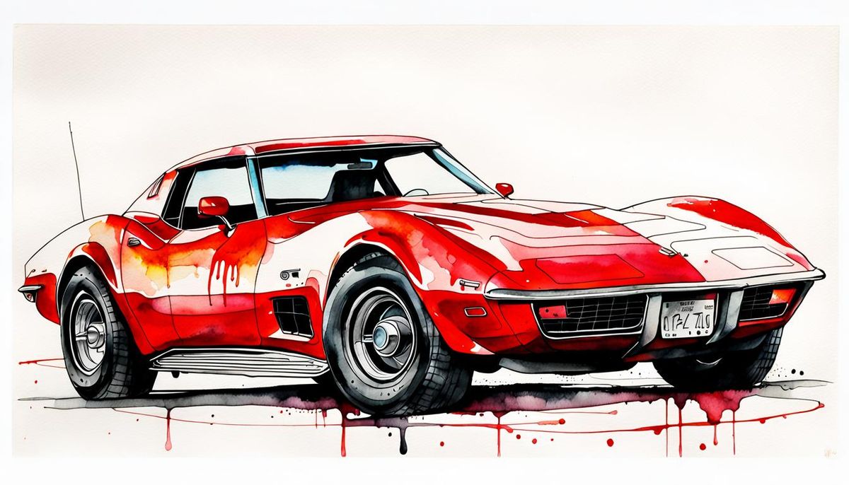 This image shows a red 1970s Corvette in a minimalist watercolor and alcohol ink painting style. Black ink outlines and a white background complete the vibrant, 3D rendered illustration.