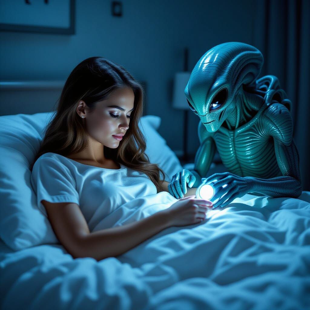 This surrealist image depicts a woman in bed with reptilian aliens extracting DNA using futuristic technology. Features deep shadows, bioluminescent lighting, and organic-mechanical details.