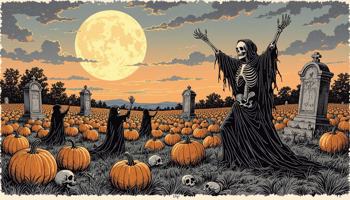 This image depicts a spooky October twilight with pumpkins, specters rising from tombs, and Death himself emerging from the earth. Rendered in a detailed, dark engraving style with a gothic color palette.