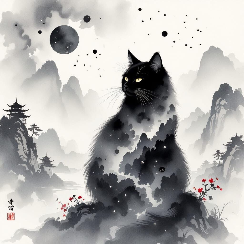 This image shows a black cat with fur transforming into ink patterns resembling stars, set in a peaceful Chinese landscape. Created in a soft, dreamlike watercolor style emphasizing calm and contemplation.