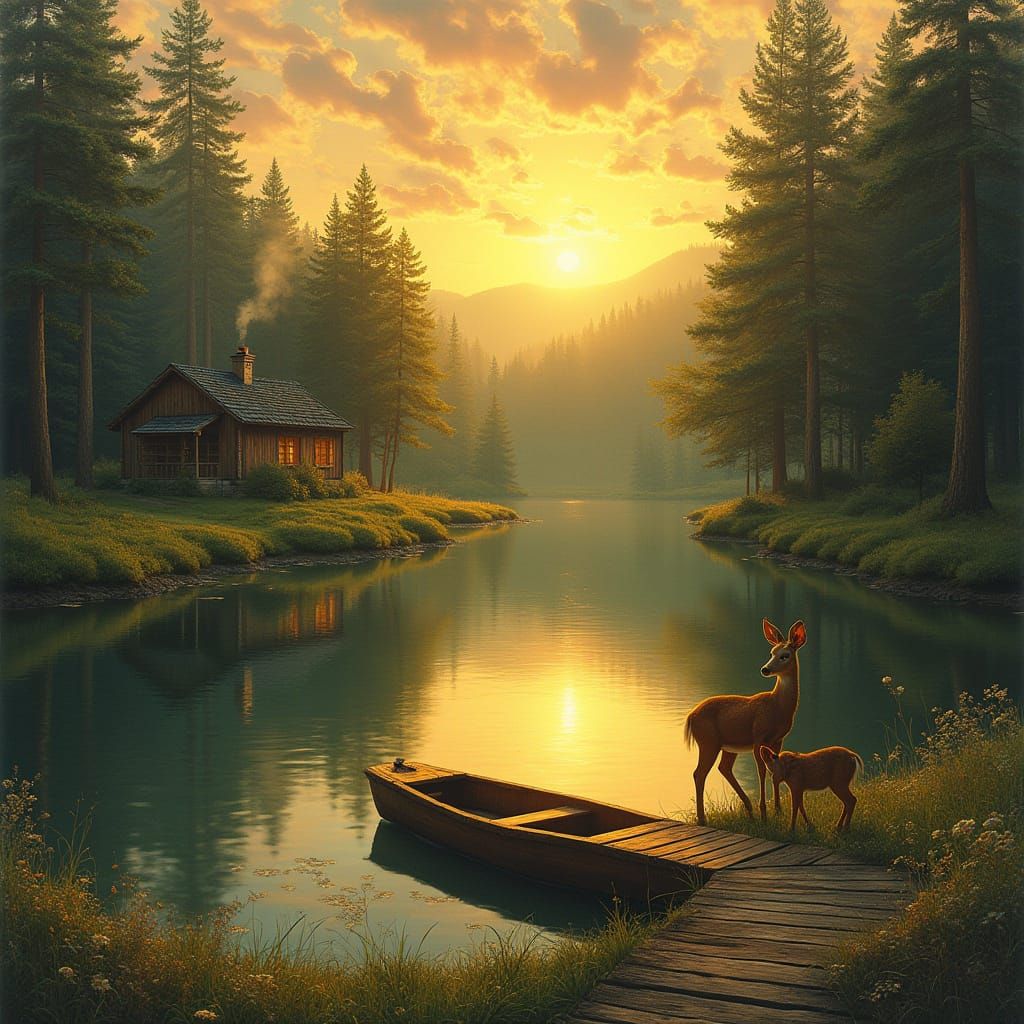 This idyllic scene depicts a serene forest dawn with warm golden light, a tranquil pond, and a cozy cabin surrounded by lush greenery and wildlife, reminiscent of classic impressionist and romantic art styles.