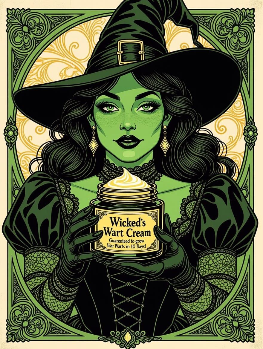 This image depicts a beautiful, green-skinned witch with a distinctive wart on her nose, holding a Victorian-style crystal jar filled with yellow cream. The illustration is reminiscent of Art Nouveau and Gothic Romanticism, with intricate details and bold, ornate design.