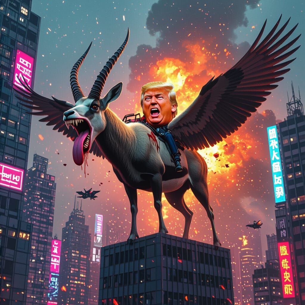 A surreal cyberpunk scene featuring a winged antelope with sharp teeth and a long tongue, carrying a screaming Trump-like face, escaping a fiery explosion amidst neon lights.