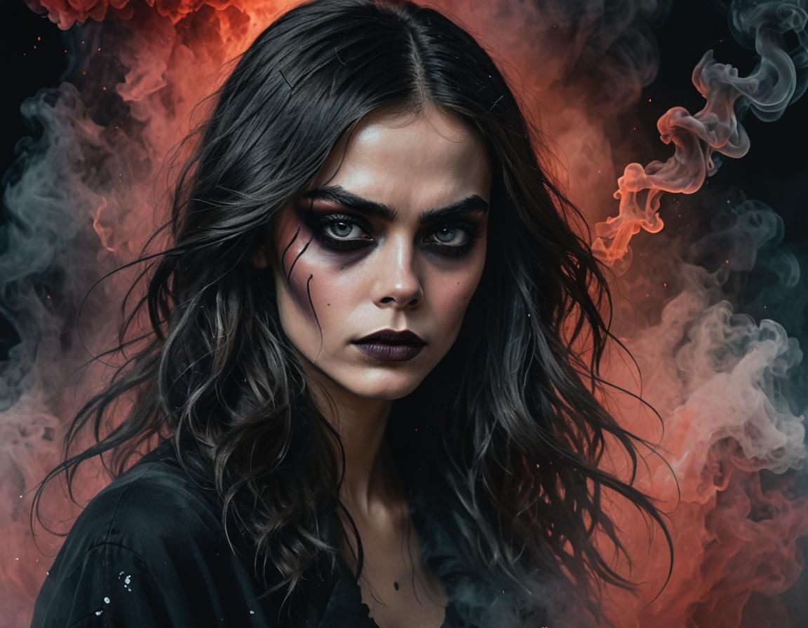Prompt: a black ghost Cara Delevingne spirit with wild black hair, light eyes, and ruby lips coming out of black misty smoke, hyperrealistic, splash art, concept art, mid shot, intricately detailed, color depth, dramatic, 2/3 face angle, side light, colorful background, masterpiece