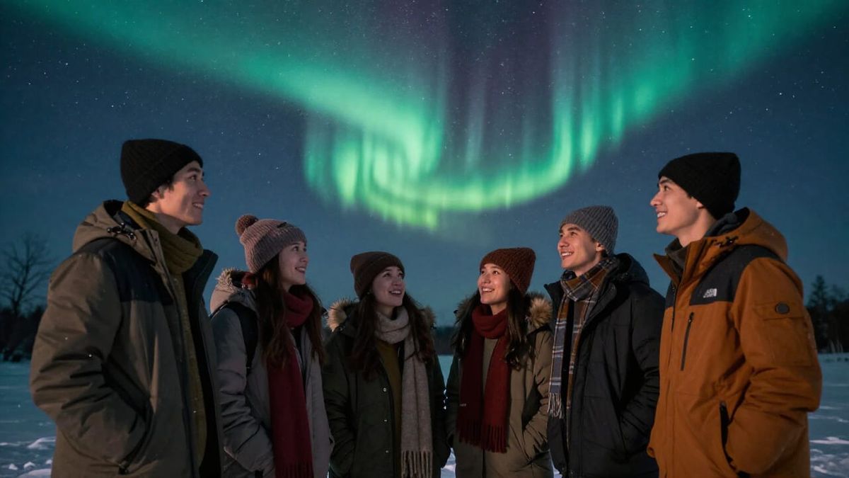 This image captures a group of friends smiling and conversing under a breathtaking winter sky filled with stars and a vibrant aurora. Photorealistic and atmospheric.