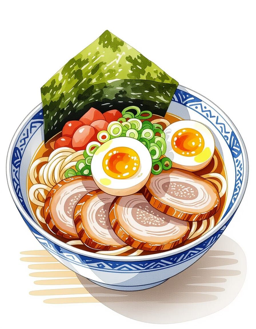 This image showcases a detailed watercolor painting of a Japanese ramen bowl. It features noodles, pork, egg, seaweed, and green onions, rendered with soft washes and warm tones.