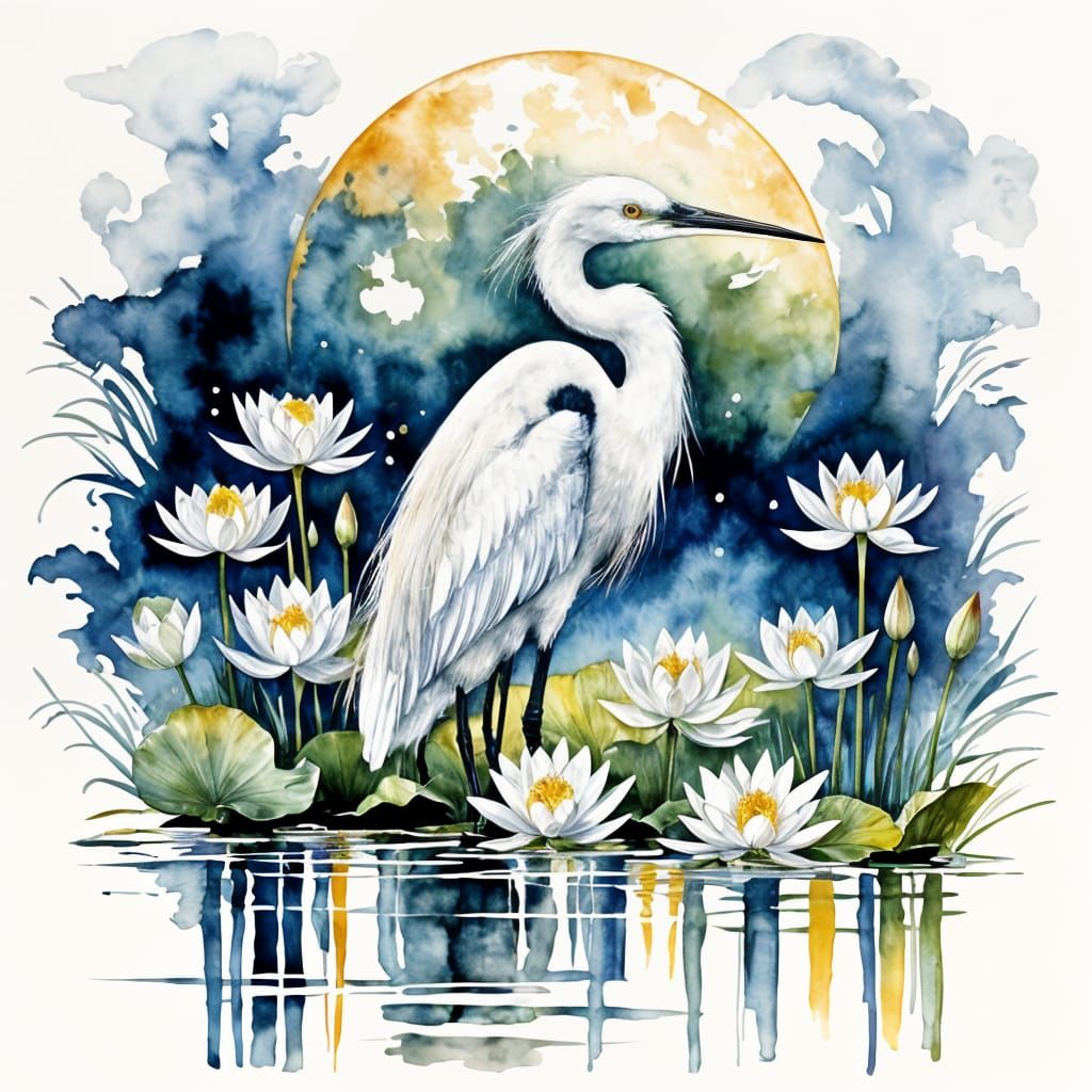 This serene watercolor painting features a majestic white heron standing amidst delicate water lilies under a full moon, with sparkling silver moonlight reflections on rippling water in a stylized and dreamy shin hanga style.