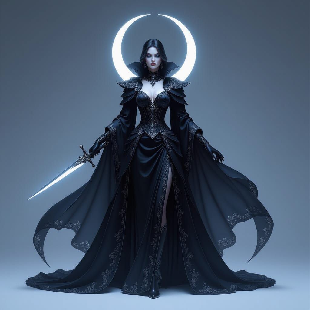 A mysterious aristocratic woman in a shadow-infused Victorian gown holds a glowing crescent blade. Cinematic lighting and stark contrasts create a commanding presence in this painterly concept art.