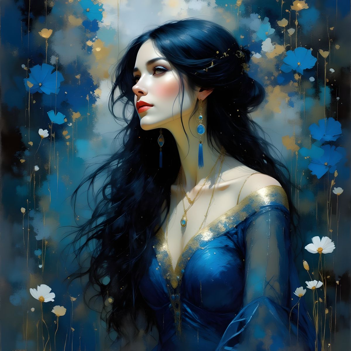 A striking portrait of a Norse goddess with flowing black hair, depicted in a monochromatic midnight blue fantasy setting. This artwork features ethereal details and a captivating, artistic style.