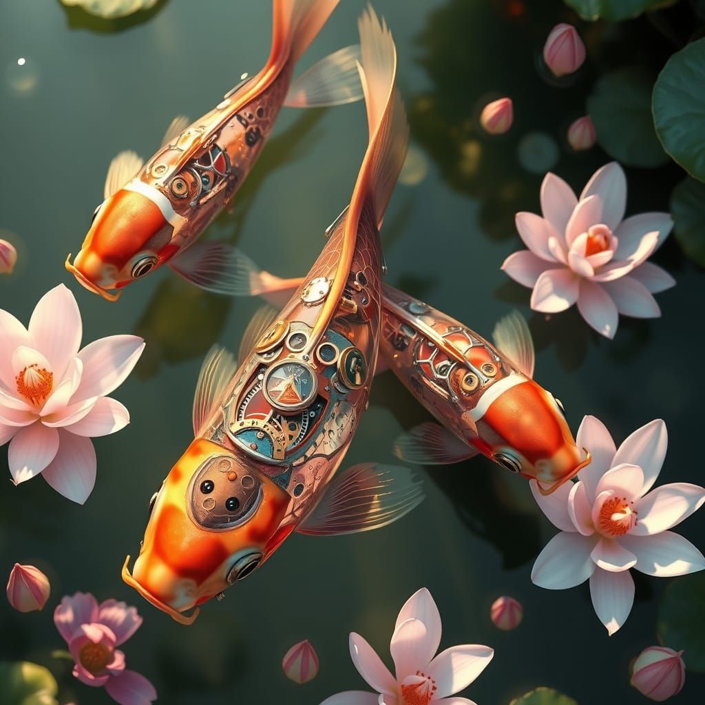 This image depicts a serene koi pond with intricately designed clockwork fish, their metallic and glass bodies glistening in the light as they swim among delicate pastel-colored lilies.