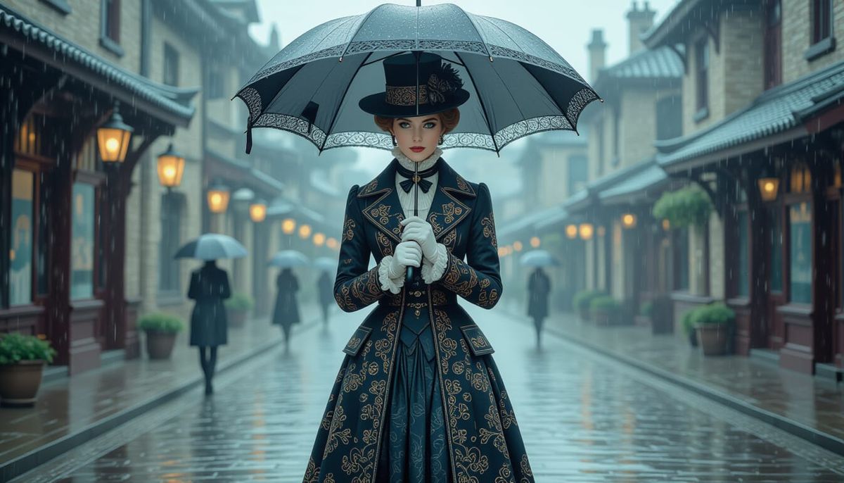 This image shows a Victorian woman in the rain with an umbrella. The photorealistic image captures wet textures and delicate details in a painterly style.