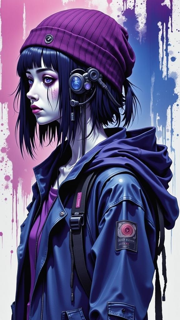 "(A young cyberpunk woman wearing a toque and being in optimistic-love:1.5) "The dream never dies as long as you are here to live it." (Idealistic:1.6). (A young cyberpunk woman wearing a hoody and questioning the unfortunate-future:1.5) "Will it be my heart or will it be his?". (Afraid:1.8). Cyberpunk, ...