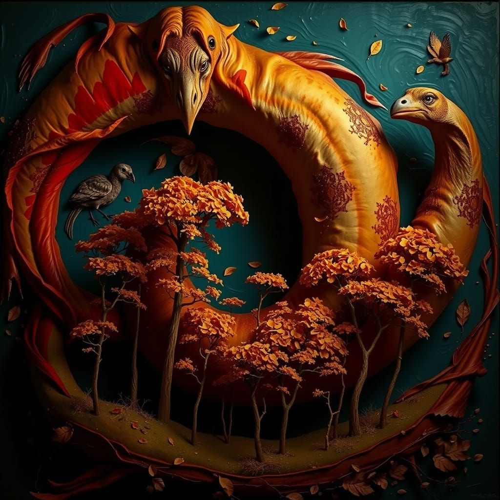 This photorealistic image depicts a vibrant landscape with a blue sky, green fields, and trees adorned with golden leaves, set against colorful distant mountains.