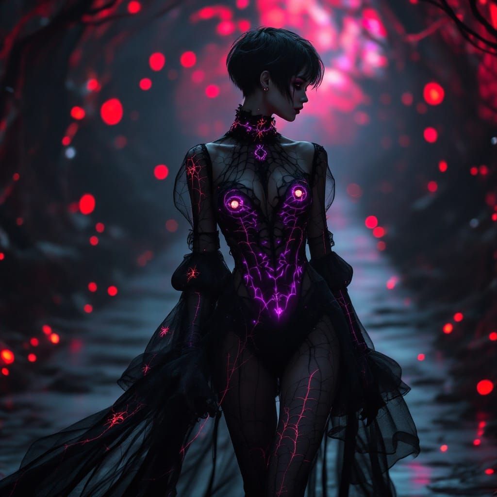 A stunning female Goth model poses on a matte runway, clad in intricate black spider web dress and sheer white top, with glowing bioluminescent tattoos and delicate blood threads, set against a deep red backdrop with a sense of high-fantasy world-building