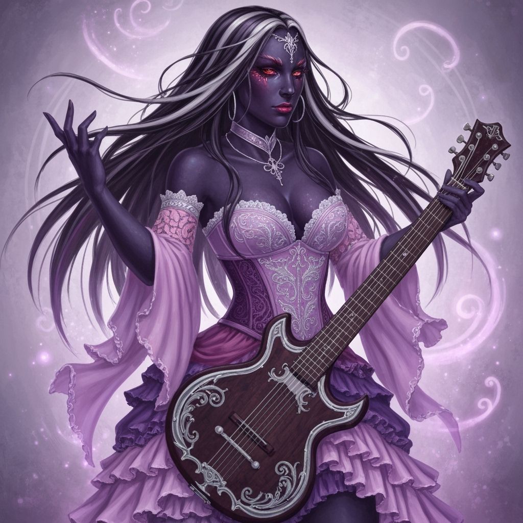 This image shows a striking drow bard with unique features and attire. She holds a dark wood guitar, enhanced by a magical aura. The artwork evokes a whimsical and ethereal atmosphere in an art nouveau style.