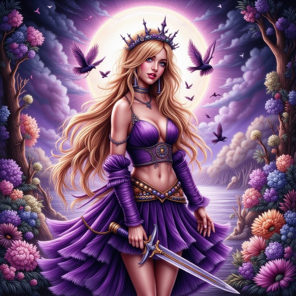 This image shows a blonde woman in a purple outfit holding a sword, as a princess in a gem world. The portrait is rendered with dynamic lighting and intricate detail.