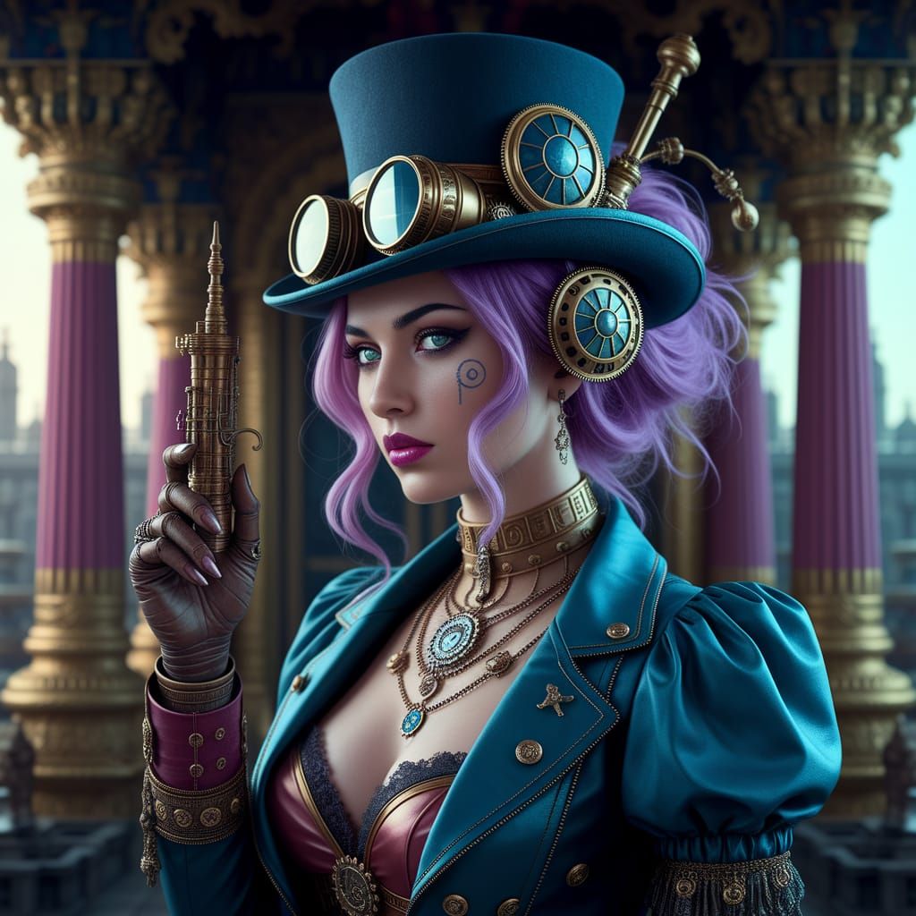 This image showcases a striking steampunk woman amidst vibrant abstract colors, set within an ancient temple backdrop.