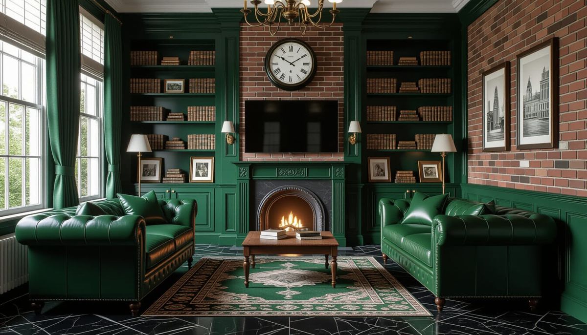 This image showcases a vibrant Victorian living room featuring a dark green leather sofa, armchair, and brick wallpaper. Sunlight illuminates the space, highlighting the black marble floor and vintage details in a photorealistic style.