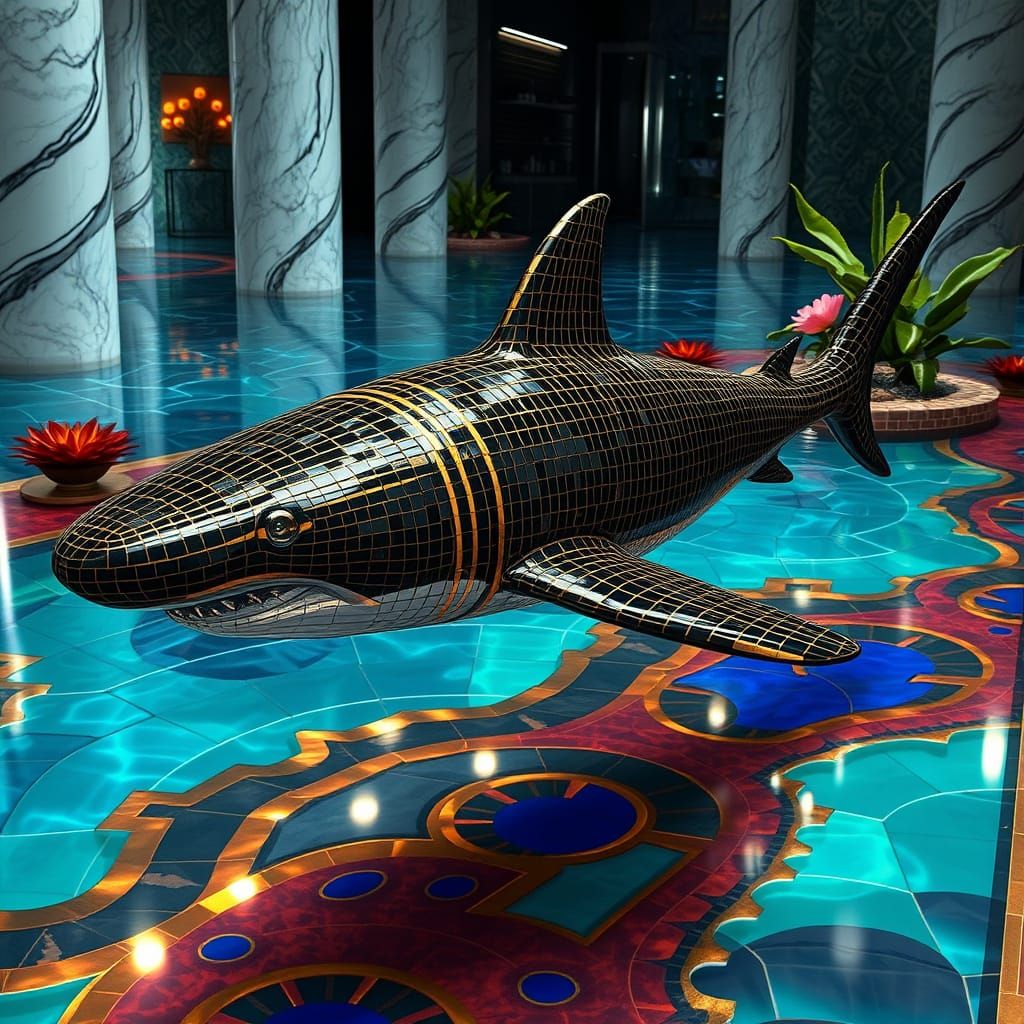 A striking picture of a shark constructed from black and gold tiles swimming in a luxurious pool. The mosaic design and vibrant pool tiles create a surreal and elegant aesthetic.