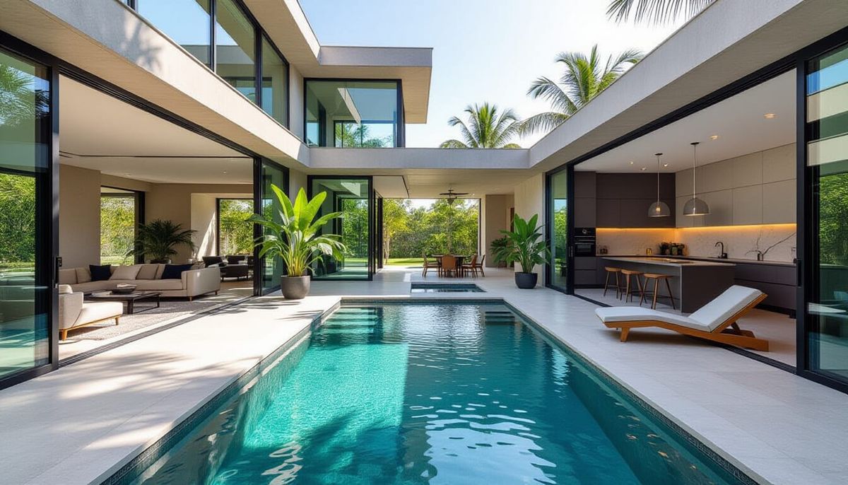 Easily design your own modern house with an internal glass patio with our AI image generator. It's free!
