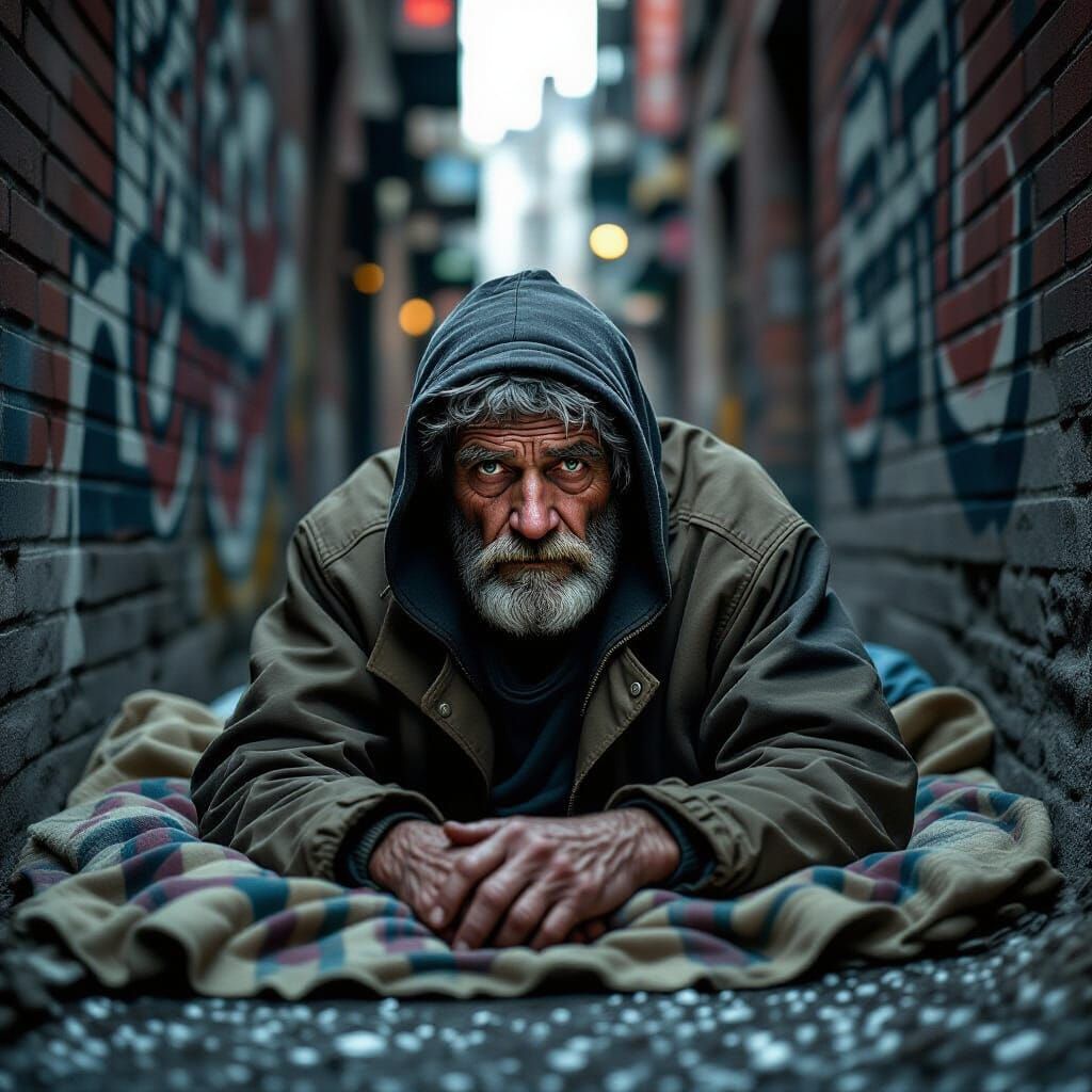 This image shows a close-up of a homeless man in a dimly lit alley. The man's face is deeply wrinkled and dirty, with sad, sunken eyes, rendered with photorealistic detail, similar to documentary photography.