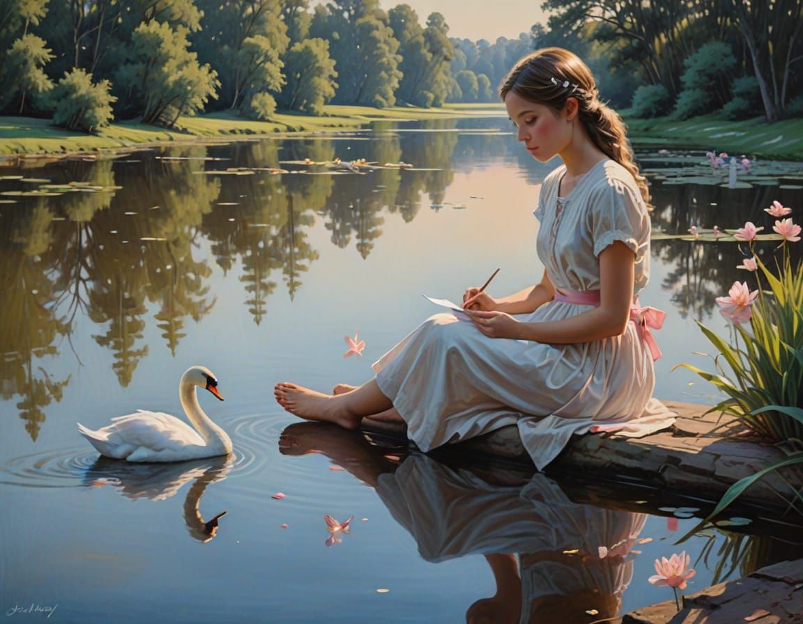 This image shows a young girl sitting barefoot by a calm lake, with a swan and paper boat. Rendered with soft pastels and delicate brushstrokes in a realistic, impressionistic style.
