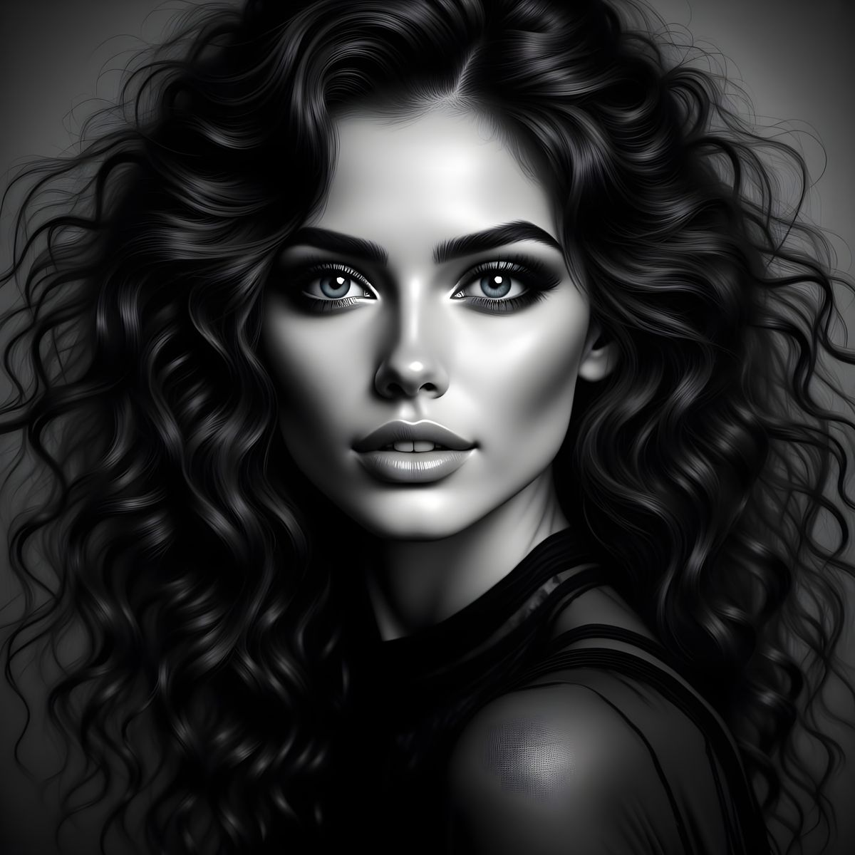 This image shows a black and white portrait of a woman with wavy hair and smoky eyes. Soft, diffused light highlights her features in this hyperrealistic style.