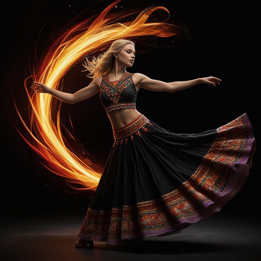 This digital painting showcases a beautiful young blond Mexican woman dancing dynamically. Full body view against a colorful, high-resolution black background with vibrant, saturated colors.