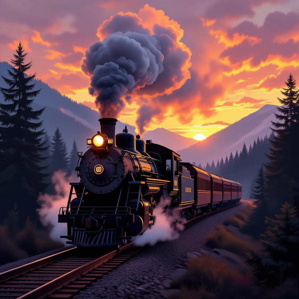 A powerful steam locomotive travels a misty mountain railway during a vibrant sunrise. Golden hour light highlights steam and dewdrops on pines in a dramatic, painterly style.