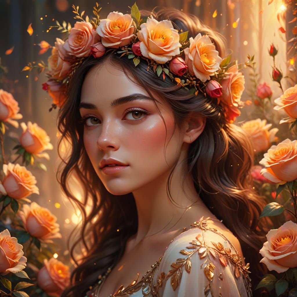 This digital painting features a young woman with a delicate floral crown, bathed in ethereal golden hour light with glowing embers. The art style is fantasy with a soft, warm color palette and soft focus.