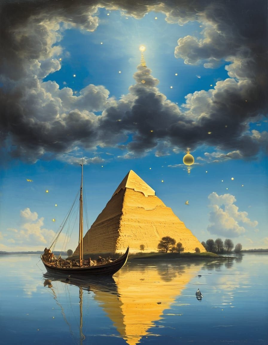 This image shows a large, contemplative woman with a landscape on her head, surrounded by floating architectural structures, a ship sailing on a stylized body of water, and a mystical sky with a soft color gradient and starry night sky, creating a dreamy atmosphere