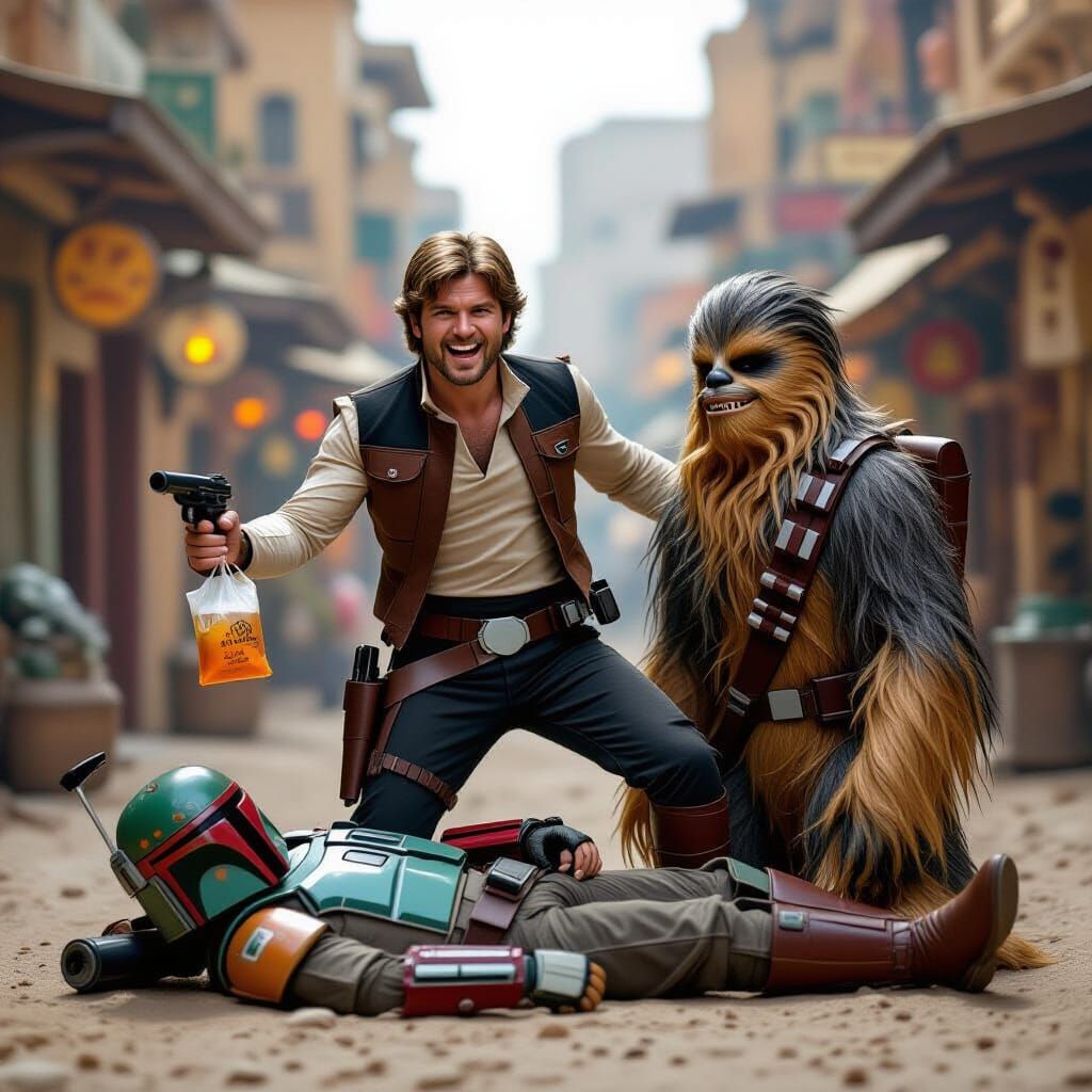A humorous image depicting a science fiction character standing triumphantly over another fallen figure in a desert setting, with a laughing, furry companion in the background.